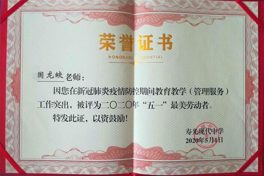 4月30日,寿光现代中学举行首届“五一”最美劳动者表彰大会,国龙蛟、李金萍老师夫妇同登台共获奖,是学校唯一一对同在高三同时授表彰的夫妇。