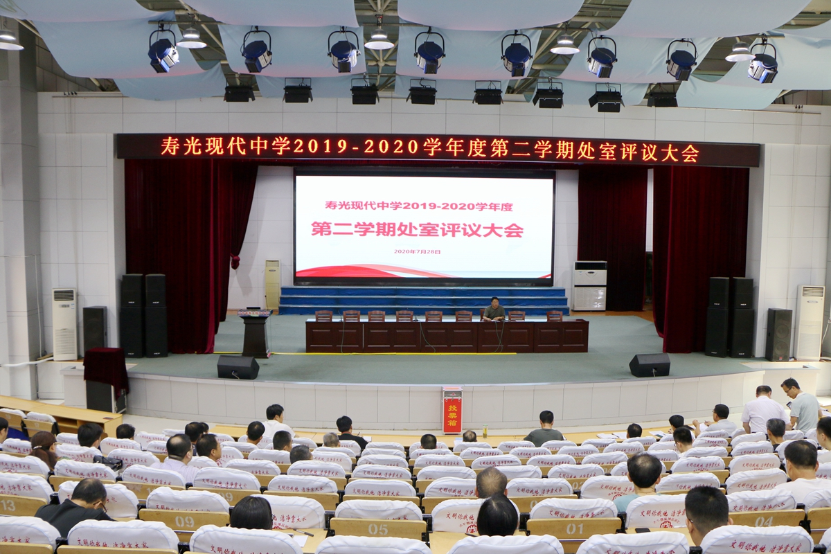 为全面总结本学期工作,7月28日下午,寿光现代中学召开2019—2020学年度第二学期处室评议大会,前后勤处室主任代表处室进行述职汇报。学校校长、党委书记孙安源带领全体党委会成员、前后勤所有人员及服务对象评委代表参会。副校长赵国田主持会议。