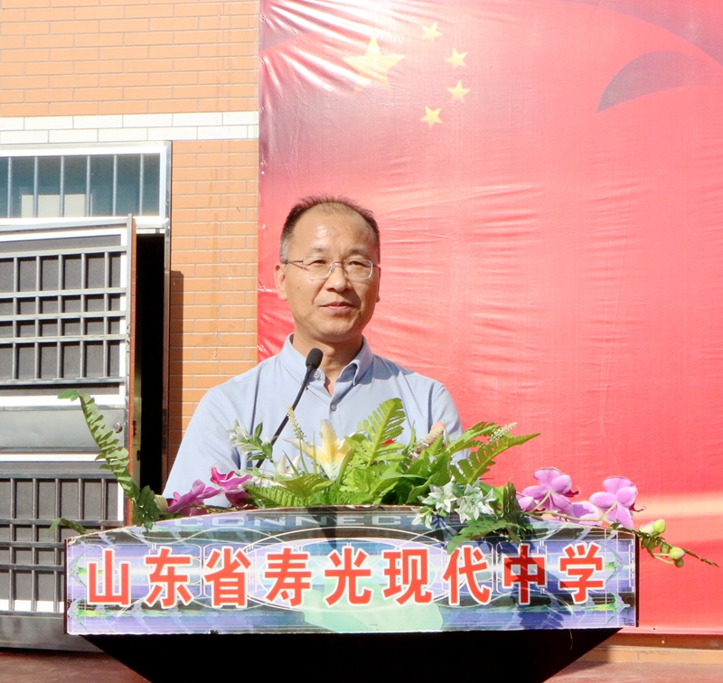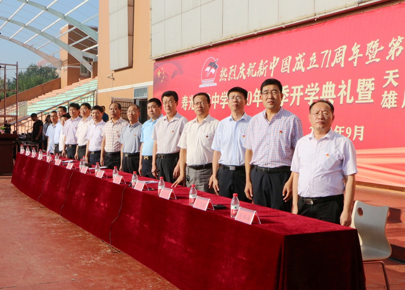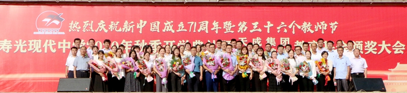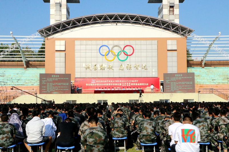 金秋九月,天高气爽;大美现代,硕果飘香。9月9日早上,迎着满蕴希望的朝阳与晨风,寿光现代中学全校师生欢聚在体育场,热烈庆祝新中国成立71周年暨第三十六个教师节,隆重举行2020年秋季开学典礼暨天成集团、雄风、鲁源教育基金颁奖大会。寿光市青年企业家协会会长、寿光现代中学名誉校长、天成食品集团总裁郭百礼,寿光市雄风气体有限公司总经理张建名、山东鲁源化工科技有限公司总经理许明然出席大会。学校校长、党委书记孙安源带领学校领导班子及全校近7000名师生参加。大会由学校副校长赵国田同志主持。