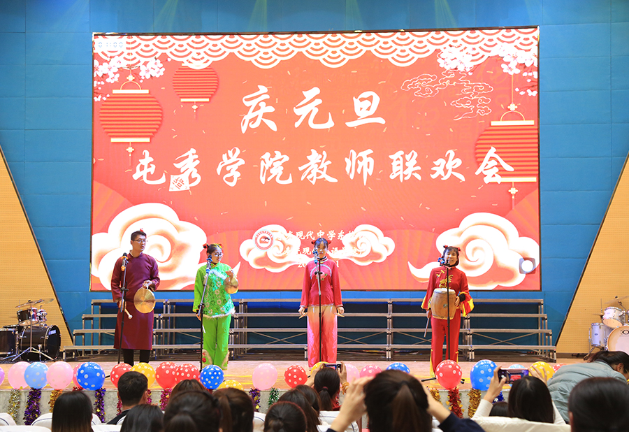 又到辞旧迎新时,12月21日下午,现代中学东校区全体老师齐聚一堂,喜迎新年。联欢会上歌声悠扬,舞姿蹁跹,学校各学部及行政组“各显神通”,自编、自演、自排的近30个节目有歌舞、小短剧、戏曲、朗诵、合唱、独唱……轮番上阵,充分展现了东校老师们的创意和活力。在《生日帽蒙眼踢毽子》、《你比我来猜》、《疯狂猜歌名》等游戏环节,老师们有趣搞笑的表现让全场笑声掌声不断。整场晚会,歌声、笑声、掌声、欢呼声交融在一起,全体教职工的希望与热情都在此刻被点燃,欢乐的气氛洋溢在礼堂的每一个角落,笼罩着每一位教师,2个多小时的欢声笑语给全体教师留下了美好的记忆。