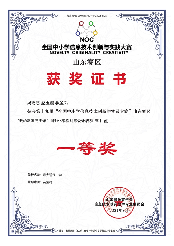 信息技术类竞赛哪家强?请看寿光现代中学光荣榜。2021年8月,2021年全省信息技术类竞赛落下帷幕,寿光现代中学喜传捷报:参加NOC(全国中小学信息技术创新与实践大赛)大赛编程以及机器人赛项的22名同学全部获奖:李博瀚等15名同学获得省级决赛一等奖,7名同学获得二等奖,其中王曦等7名同学以优异成绩获得国赛决赛资格;在全国中小学信息素养能力提升大赛中,徐英恺同学的微视频作品被山东省电教馆推送参加“第二十二届全国学生信息素养提升实践活动”评选,并以本项目第二名的优异成绩通过了入围作品的线上答辩,这是潍坊市高中组唯一获奖作品;袁浩洋同学以山东省一等奖的成绩参加国家级比赛,并获得国家级二等奖。这是近期继学校生物奥赛有两名学生分别以第一名和第四名的成绩入选省集训队之后,又一次获得的几项国家级和省级大奖。在此,向获奖学生和竞赛教练表示祝贺,希望全体同学再接再厉,勇攀高峰,再创辉煌。