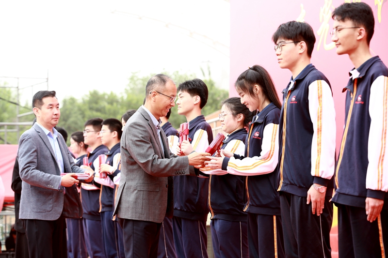 志存高远,奋勇前行。孙安源校长和强基年级校长张会智一起为毕业生代表颁发毕业证书。火红的证书,见证着拼搏与成长,承载着沉思与智慧,也收录着同学们砥砺奋进的青春时光。
