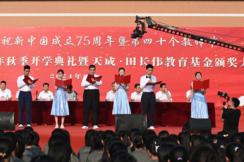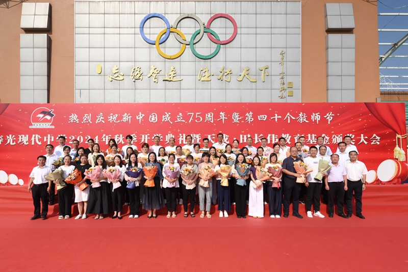 秋光为序,启航新程。9月8日早上,寿光现代中学全体师生在学校体育场集会,热烈庆祝新中国成立75周年和第40个教师节,隆重举行2024年秋季开学典礼暨天成集团·田长伟教育基金颁奖大会。天成食品集团副总裁李进文先生、金顿集团总裁田长伟先生出席会议。寿光现代中学党委书记丁超德带领校级班子成员及全体师生参会。