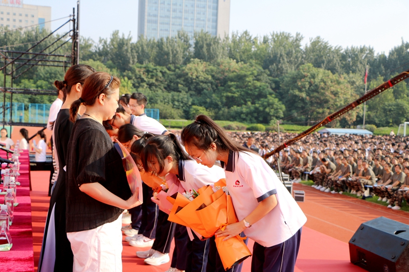 硕果累累,鸿鹄榜样。高二年级侯霖轩、李明原等六位同学代表全体同学饱含深情、激情澎湃地为教师节献词:亲爱的老师,感谢您用无私的爱心陪伴我们成长,您就是我们身边最可爱的人……最真挚的话语见证着最美的师生情。