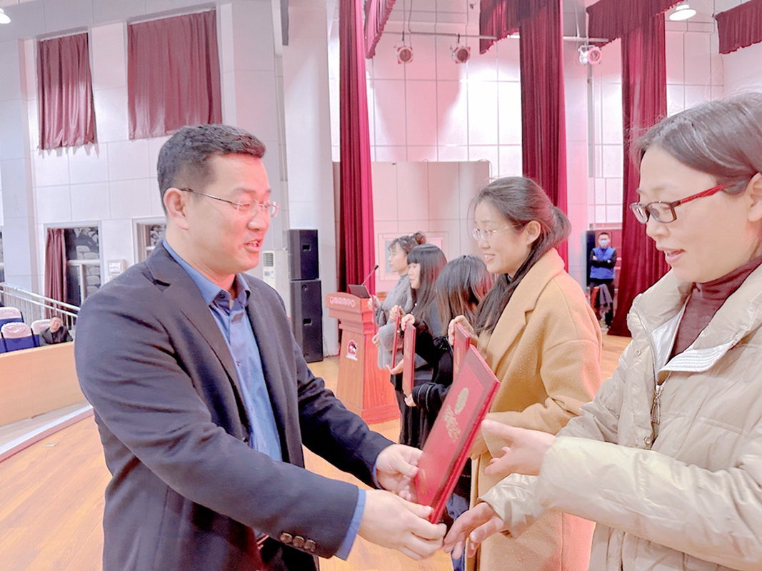 柔肩亦能担重任,倾尽心血育桃李。女教职工们用包容与贤达全力演绎着家庭中的每一角色,以热爱与坚守在平凡的岗位上谱写出一曲奉献之歌。她们是旗帜,更是榜样。校级班子成员为“‘三八’巾帼旗手”获奖者颁发证书。