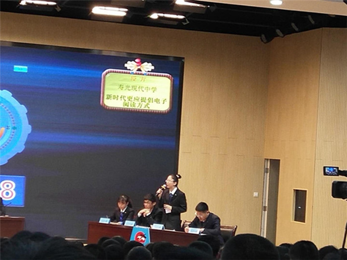 现代中学辩论队第一场比赛为反方,所持观点为“新时代更应提倡电子阅读”,正方所持观点为“新时代更应提倡传统阅读”。立论阶段,我方逻辑线清晰,多层面展开阐述,稳固了论辩底盘;攻辩和自由辩阶段,双方围绕“什么应该提倡”和“新时代”的限定性两条论辩线展开攻防,我方以 “式微与衰落不应成为提倡的理由”为主线辩驳,确立了绝对优势;结辩驳立结合,梳理清晰全面。最终赢得胜利,李汪洋同学被评为本场最佳辩手。