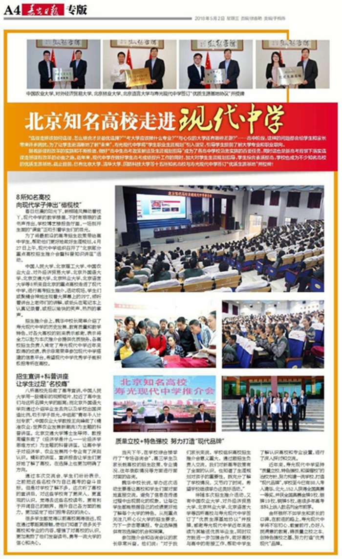 为了将最前沿的高考招生政策带给高中学生,帮助他们更好地做好生涯规划,4月27日上午,寿光现代中学组织召开了“北京部分重点高校招生推介会暨科普知识讲座”活动。5月2日,《寿光日报》以“北京知名高校走进寿光现代中学”为题,整版刊发我校招生推介会情况。