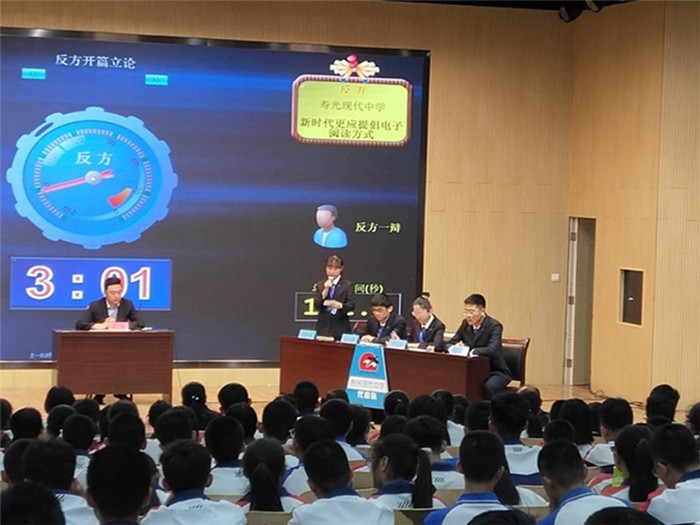 现代中学辩论队第一场比赛为反方,所持观点为“新时代更应提倡电子阅读”,正方所持观点为“新时代更应提倡传统阅读”。立论阶段,我方逻辑线清晰,多层面展开阐述,稳固了论辩底盘;攻辩和自由辩阶段,双方围绕“什么应该提倡”和“新时代”的限定性两条论辩线展开攻防,我方以 “式微与衰落不应成为提倡的理由”为主线辩驳,确立了绝对优势;结辩驳立结合,梳理清晰全面。最终赢得胜利,李汪洋同学被评为本场最佳辩手。
