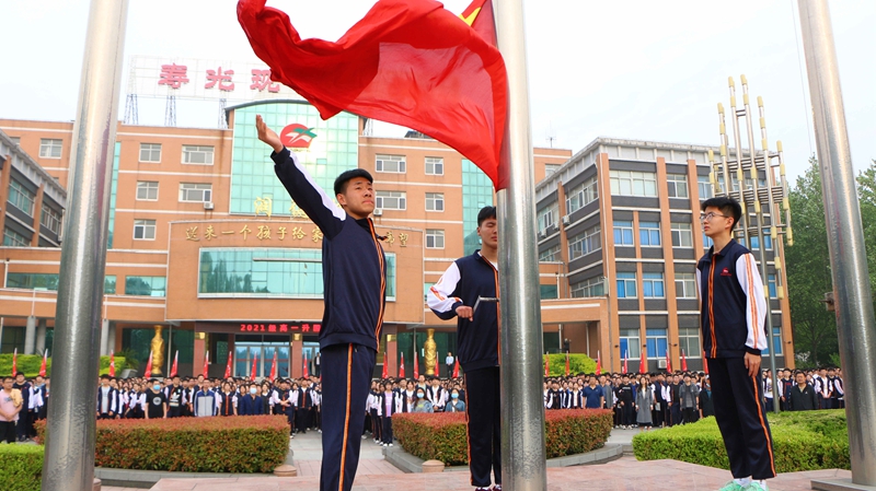 在高一四部主任任方华的带领下,全体同学高举右手,在国旗下庄严宣誓。一句句掷地有声的宣言,定将化为前行力量,以奋斗、拼搏的青春,创造崭新未来。