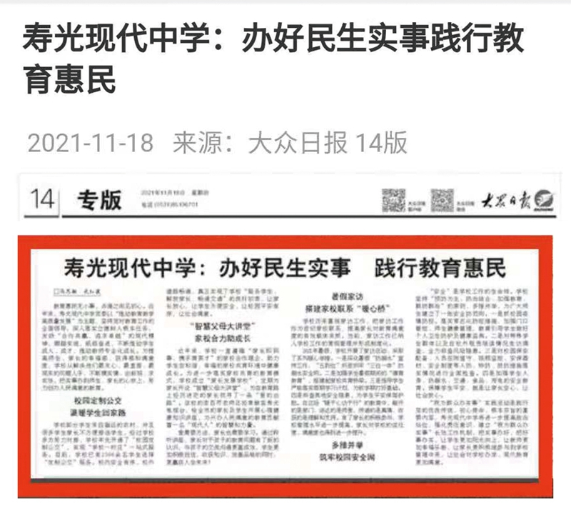 《大众日报》以“办好民生实事 践行教育惠民”为题,刊登学校“我为群众办实事”经验做法;《山东教育报》以“一节‘特殊’体育课”“强化心理服务体系建设 助推学校特色发展”为题,连续刊登两篇文章报道学校高考前减压活动及“心理育人”取得的成绩;寿光市政府第31期信息简报以“学史增信筑信心 凝心聚力促提升”为题,推广学校党史学习经验;寿光市防溺水工作组两次以通报表扬形式肯定学校在防溺水工作中取得的经验和成绩;《潍坊日报》以“最是书香能致远—首届校园读书节硕果累累”“致敬建党百年 传承红色精神”“‘四个到位’织密织劳防溺水安全网”等题目,刊登学校经验类文章13篇;学习强国推出学校心理类讲课视频6篇;另外,《潍坊教育发布》《学在寿光》等教育部门官方网站及新华网、大众网等重量级网站推出我校教育教学经验类文章42篇,凸显了学校强大的办学影响力。