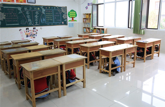 听到震警信号后,教室里的学生迅速躲在课桌下,约1分钟后,各班学生都在老师的指挥下快速有序的疏散,各通道重要位置均有老师指挥学生安全撤离。从教室里按照指定逃生路线安全有序撤离至操场空旷地带,各班迅速清点学生数并向防震演练指导小组长汇报情况。此次演练活动,整个过程只用了短短2分半钟。演练按预案进行,整个演练过程既紧张,又有条不紊。演练结束后,王国辉副校长进行了总结讲话。