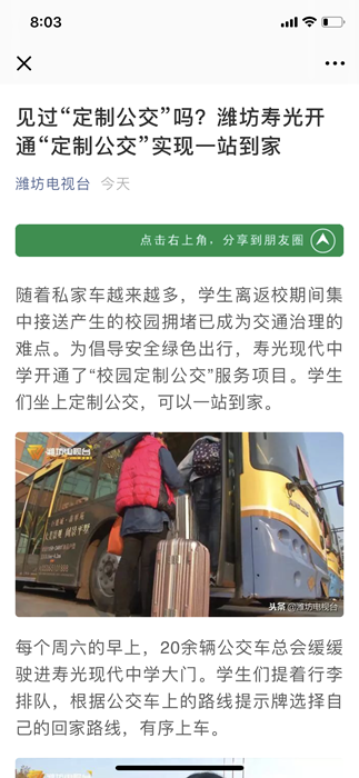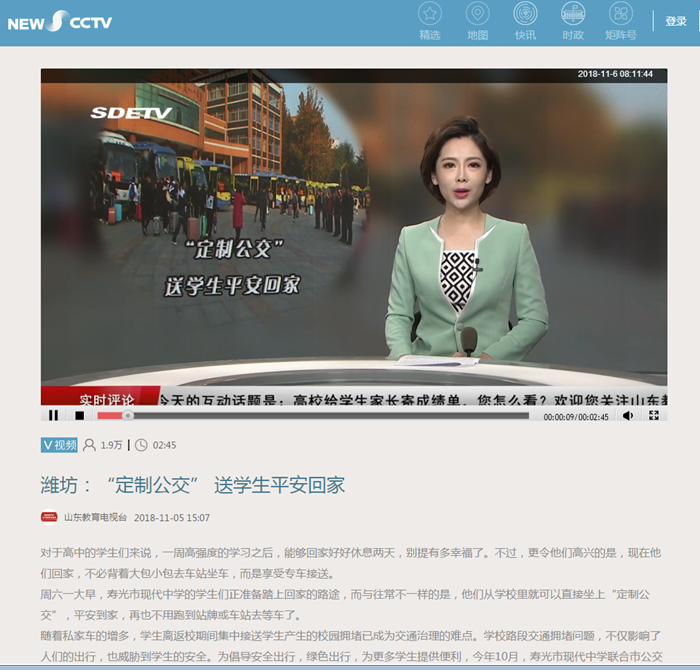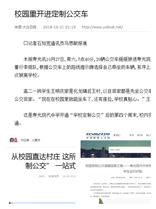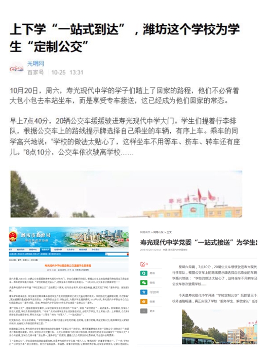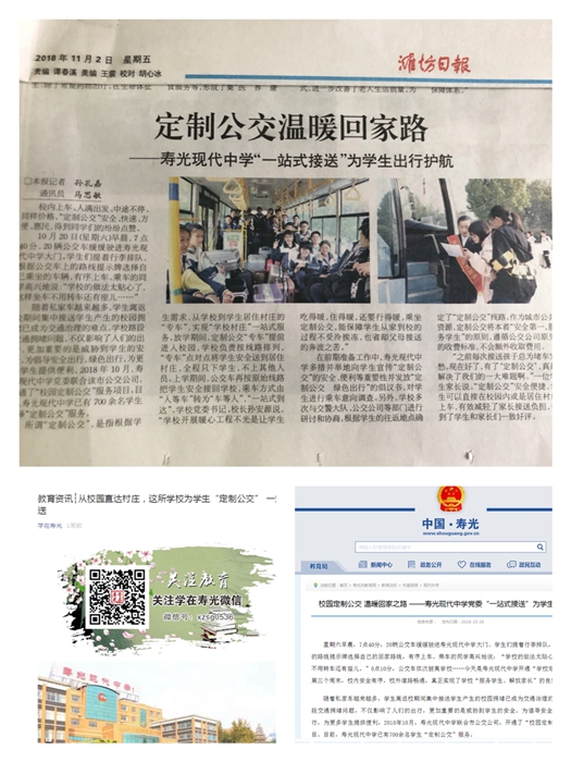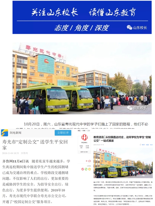 10月20日,寿光市教育局“学在寿光”公众号以《校园定制公交 温暖学生回家之路》为题,对寿光现代中学“定制公交”的做法进行了报道。央视新闻移动网、大众日报、潍坊日报、寿光日报、山东校长公众号、潍坊教育公众号、潍坊教育信息港、光明网、网易新闻、等多家媒体对文章进行了转发。11月3日,山东电视台教育频道、潍坊电视台到寿光现代中学对这一暖心做法进行了深度报道。