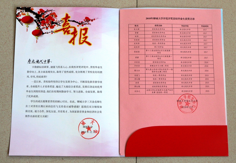 近日,华中科技大学、西北农林科技大学、北京邮电大学、山东农业大学、山东女子学院、聊城大学给我校发来喜报。我校毕业生继续发扬母校的优良学风,在大学刻苦学习,获得优秀成绩,为此,六所高校特向我校发来喜报,感谢寿光现代中学多年来一直为其输送优秀学生,对寿光现代中学的辛勤培育表示衷心感谢!