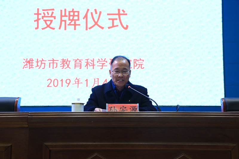 在研讨会上,现代中学被确定为潍坊市高中体育与健康学科基地,潍坊市教科院教师发展中心俞文东主任向现代中学校长孙安源颁发了基地牌匾。孙安源校长代表学校致辞,并就学校办学特色和成绩以及未来在体育教学方面的打算做了汇报。