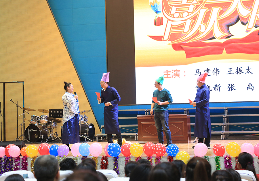 又到辞旧迎新时,12月21日下午,现代中学东校区全体老师齐聚一堂,喜迎新年。联欢会上歌声悠扬,舞姿蹁跹,学校各学部及行政组“各显神通”,自编、自演、自排的近30个节目有歌舞、小短剧、戏曲、朗诵、合唱、独唱……轮番上阵,充分展现了东校老师们的创意和活力。在《生日帽蒙眼踢毽子》、《你比我来猜》、《疯狂猜歌名》等游戏环节,老师们有趣搞笑的表现让全场笑声掌声不断。整场晚会,歌声、笑声、掌声、欢呼声交融在一起,全体教职工的希望与热情都在此刻被点燃,欢乐的气氛洋溢在礼堂的每一个角落,笼罩着每一位教师,2个多小时的欢声笑语给全体教师留下了美好的记忆。