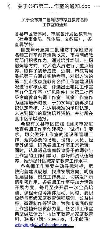 2019年12月23日,潍坊市教育局公布第二批潍坊市家庭教育名师工作室(11个),我校李百芹工作室名列其中,为寿光市普通高中唯一;2019年12月24日,潍坊市卫生健康委员会成立潍坊市社会心理服务体系建设试点工作指导专家组(9名),李百芹老师是潍坊市唯一教育系列入选的专家。祝贺李百芹老师,为自己和学校赢得了殊荣!