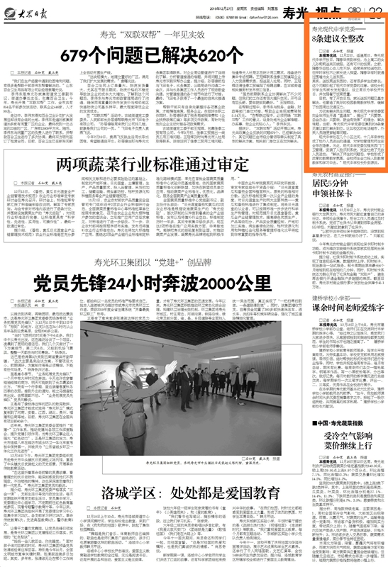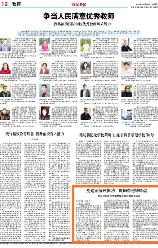 2019年12月27日,《大众日报》《潍坊日报》分别以“寿光现代中学党委——8条建议全整改”“党建领航风帆劲,砥砺奋进铸辉煌”为题,刊发我校党建信息。