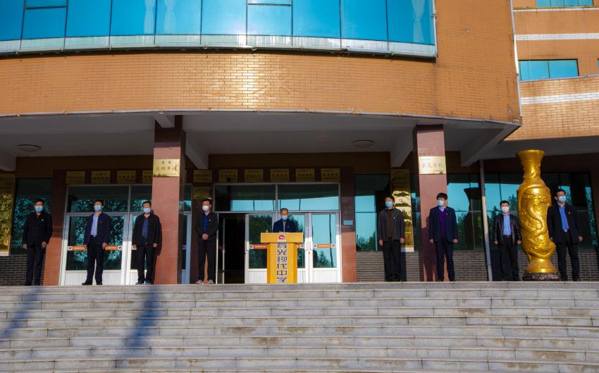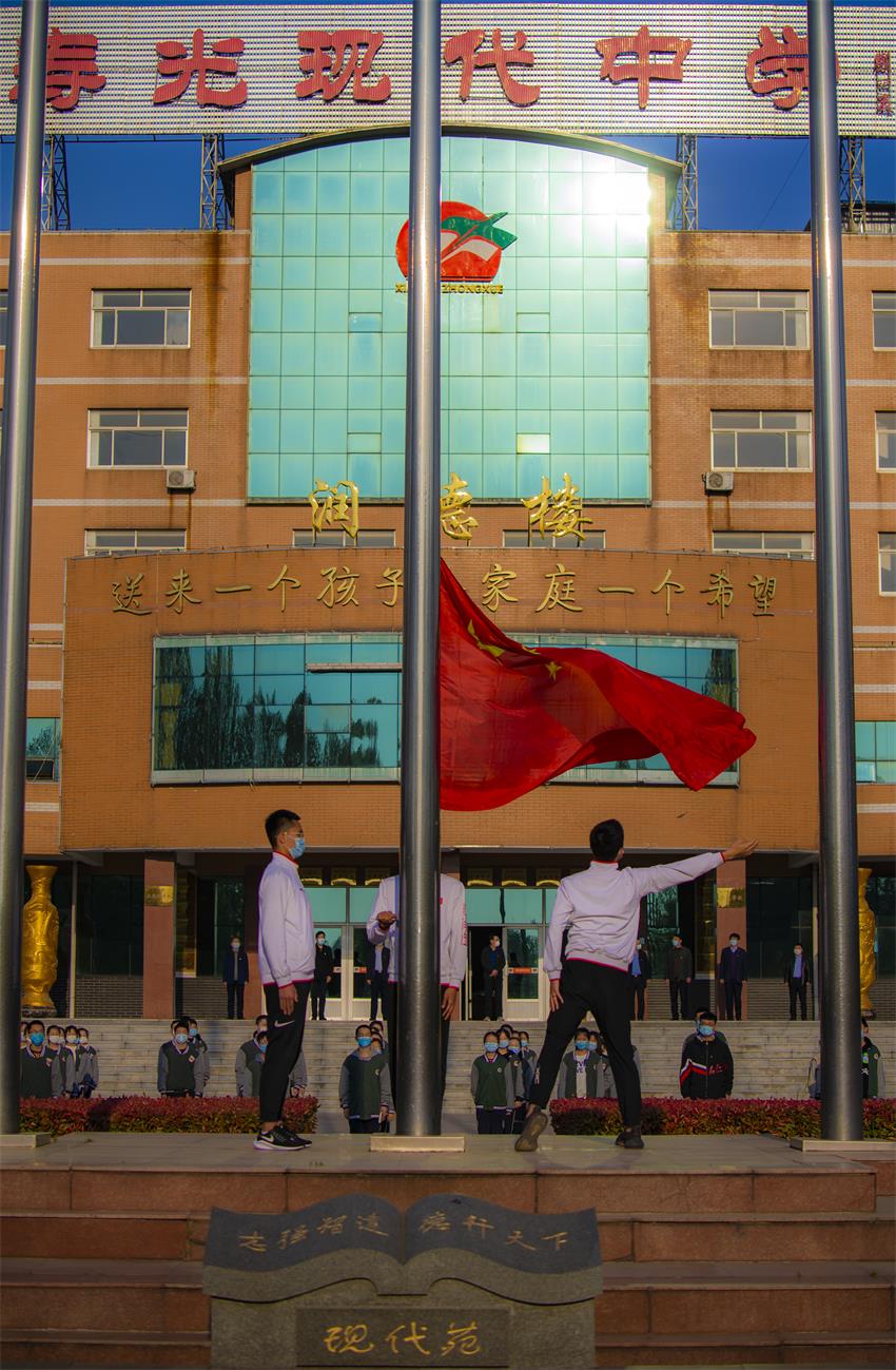 学校校长、党委书记孙安源及全体班子成员参加,党委委员、高三年级负责人张法国主持。鲜艳的五星红旗伴随着雄壮有力的国歌声,在全体师生庄严的注目礼中冉冉升起,高高飘扬在现代中学现代苑广场。
