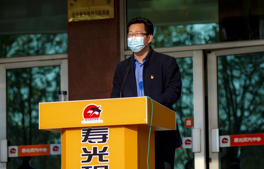 4月27日上午6:50,寿光现代中学高三2200名学生戴着口罩、保持着安全距离,整齐分列站立在现代苑广场,举行了一次意义特殊的升旗仪式。