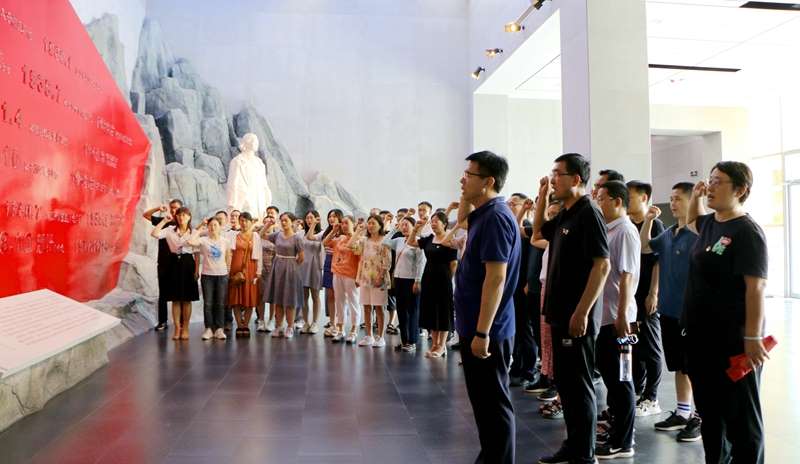 参观结束后,全体党员在党旗前重温入党誓词,全体党员和入党积极分子更加坚定了为共产主义事业奋斗终身的理想信念。大家一致表示,要以革命先辈为灯塔,积极传承和弘扬陈少敏等老一辈无产阶级革命家的革命精神,学习他们优良的工作作风和不屈不挠的斗争精神,进一步锤炼党性修养,以更坚定的理想信念,更昂扬的精神状态投入到今后的工作中去,以实际行动擦亮“扛红旗 争第一”的党建品牌,不忘教育初心,牢记育人使命,以更加优异的成绩迎接党的二十大胜利召开,全心全意办好人民满意的教育。