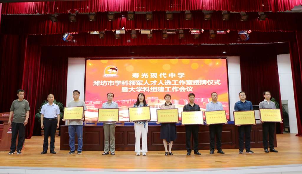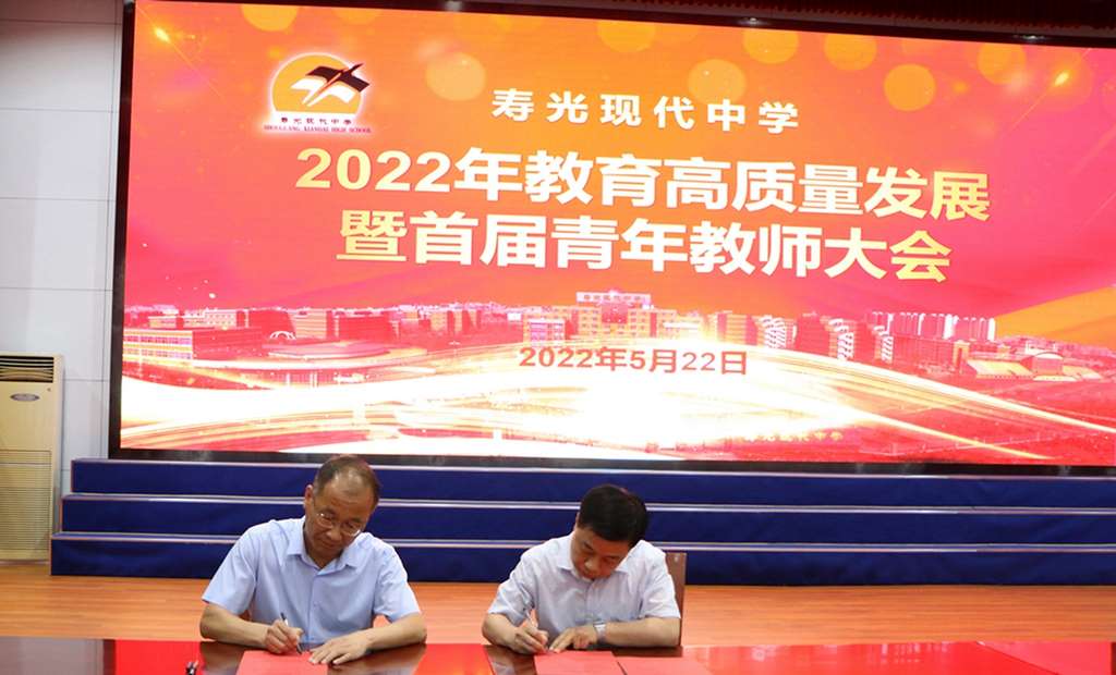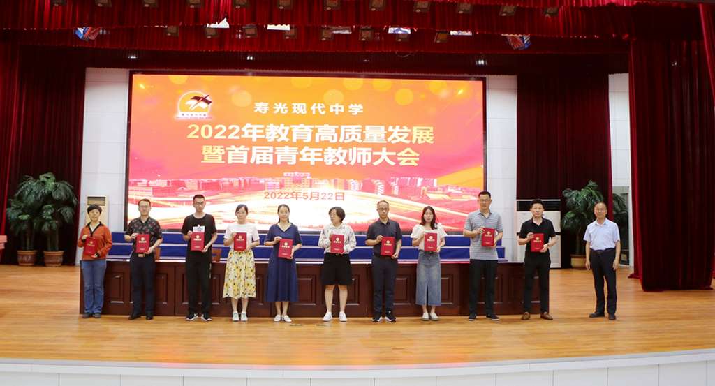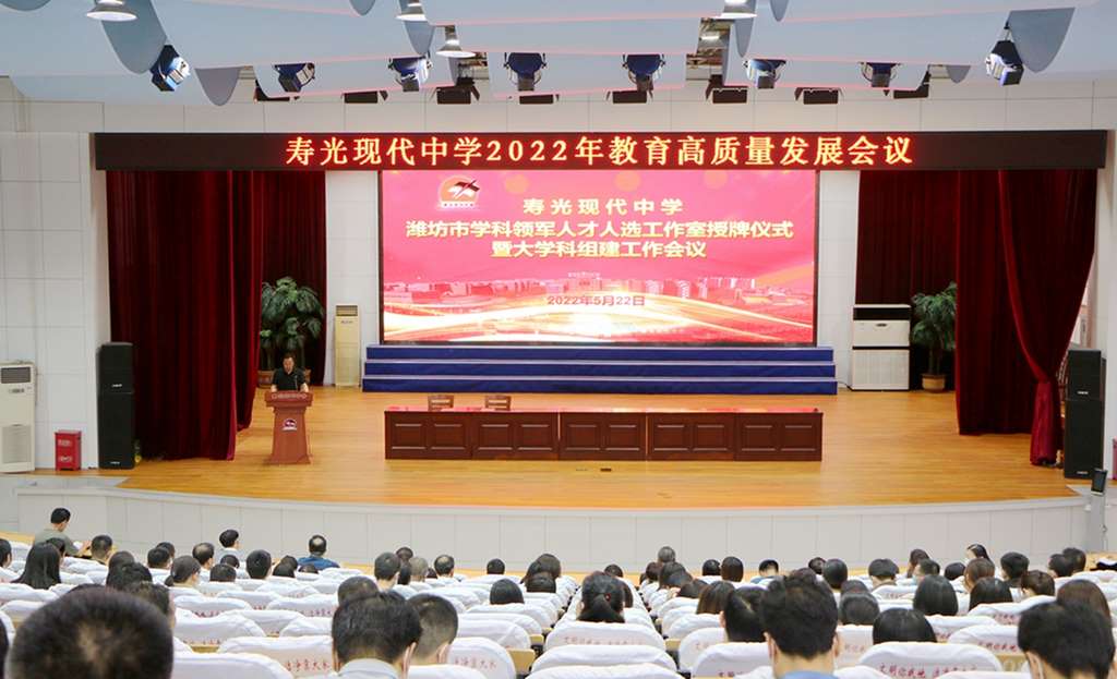 行者方致远,奋斗路更长。为表扬优秀,鼓励先进,营造浓厚的教学氛围,力争以更加优异的教育成绩迎接党的二十大胜利召开,5月22日晚,寿光现代中学2022年教育高质量发展会议在艺术楼报告厅召开。会议分两个阶段,第一阶段为寿光现代中学潍坊市学科领军人才人选工作室授牌仪式暨大学科组建工作会议;第二阶段为寿光现代中学2022年教育高质量发展暨首届青年教师大会。学校校长、党委书记孙安源与校级班子成员,学科领军人物及工作室成员,2022年五一最美劳动者、五四青年标杆,全体班主任、备课组长、35周岁以下青年教师、中层副职以上干部参加会议。