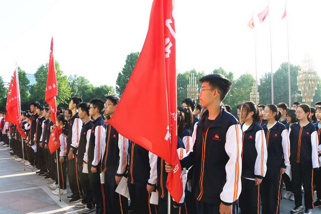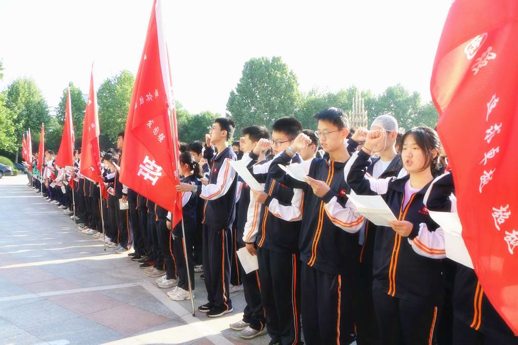 在学生代表许振强带领下,全体同学高举右手,在国旗下庄严宣誓:挑战清华北大是我无悔的抉择,决胜未来高考是我渴盼的梦想……一句句掷地有声的宣言,定将化为前行力量,以青春之我,奋斗之我,创造青春之家国,青春之民族。