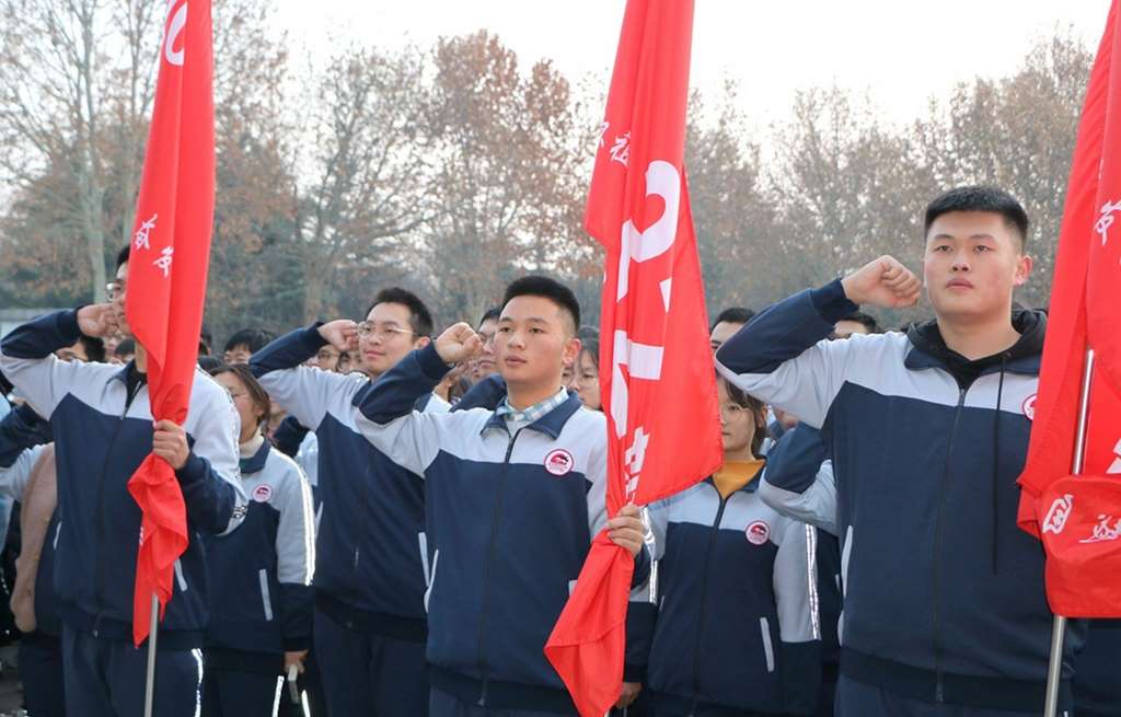 “激情澎湃,永不言败;斗志昂扬,现代最强;破釜沉舟,迎难而上;自强不息,百炼成钢;全力以赴,再创辉煌。”在高三二部副主任李友顺的带领下,师生高举右手庄严宣誓。声声誓言铿锵有力,响彻校园。