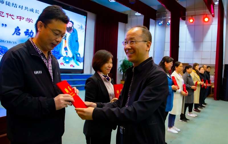 拜师仪式上,副校长杨卫忠解读《寿光现代中学“青蓝工程”实施方案》,学校校长、党委书记孙安源为导师教师颁发聘书,青年教师向导师行拜师礼,师傅代表与徒弟代表现场签订结对协议。整场仪式庄严而神圣。