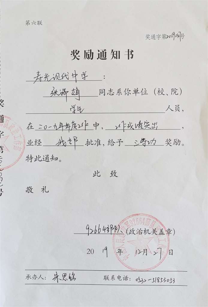 近日,寿光现代中学收到中国人民解放军某部队发来的贺信:寿光现代中学培养的学生张瑞娟,在2019年度工作中成绩突出,给予三等功奖励。