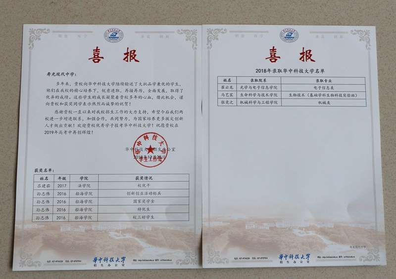 华中科技大学等六所高校给寿光现代中学发来喜报