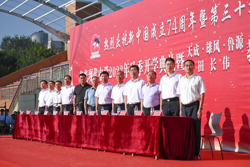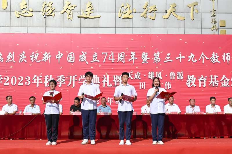 秋光为序,筑梦起航。9月7日早晨,迎着满蕴希望的朝阳晨风,寿光现代中学师生齐聚学校体育场,热烈庆祝新中国成立74周年和第39个教师节,隆重举行2023年秋季开学典礼暨天成集团·雄风气体·鲁源化工教育基金、田长伟教育基金颁奖大会。天成食品集团副总经理王志昌、雄风气体有限公司总经理张建名、山东鲁源化工科技有限公司总经理许明然出席会议。学校党委书记、校长孙安源带领校级班子成员及全体师生参会。会议由学校党委副书记单春永主持。