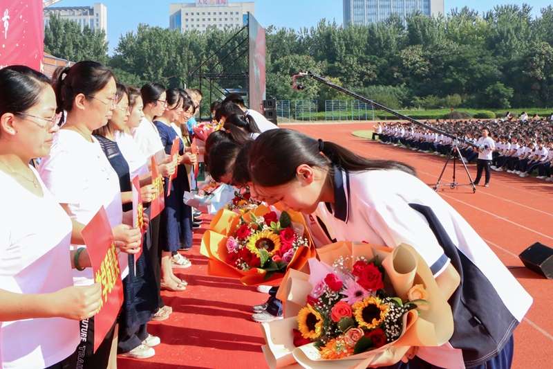 党委委员、副校长张法国宣读学校表扬通报。主席台领导为获奖师生代表颁奖,学生代表为教师敬献鲜花。高二学生张硕、桑煜凯、胡静怡、常艺乐代表全体学生为教师节献词,四位同学精神饱满,声情并茂,向老师们表达了最崇高的敬意和最真挚的祝福!