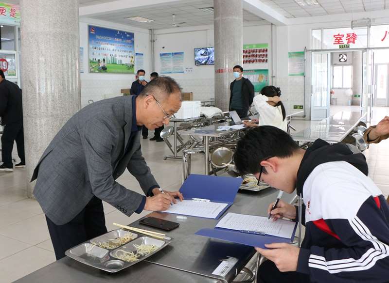 膳食处主任王子波开展了一次学生生活座谈会,以问卷调查的形式了解学生的需求,以便及时调整菜品口味及花样,确保每天的饮食能够色、香、味俱全,用心呵护学生的舌尖健康,确保学生舌尖安全。