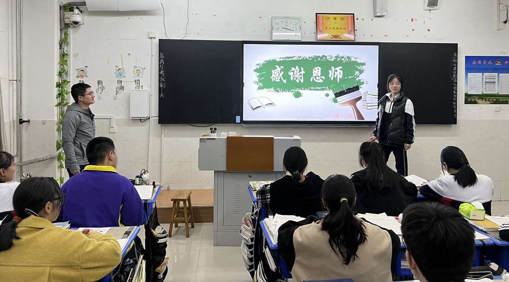 高二学生黄梓轩、肖雅若南、张思宇、张渌洋四名同学献上诗朗诵《致班主任》。一朝沐杏雨,一生念师恩,在轻柔抒情的背景音乐中,四名同学代表全体学生,以最真挚的情感,向辛勤耕耘、朝夕陪伴他们的班主任致敬!