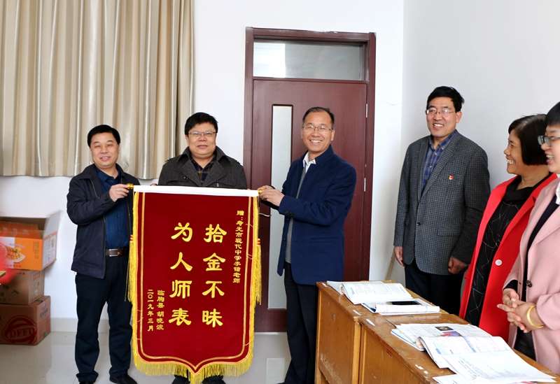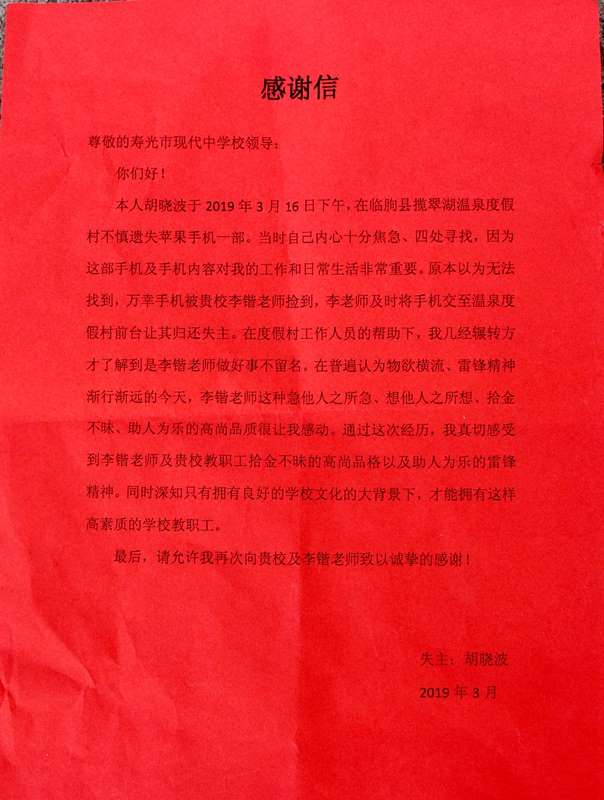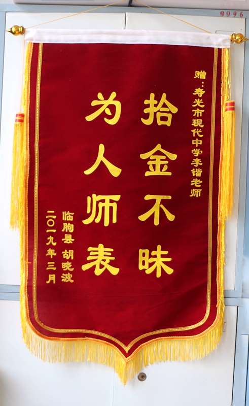 2019年3月29日,星期五,寿光现代中学校长、党委书记孙安源收到一封感谢信和一面印有“拾金不昧 为人师表”的锦旗。寄送锦旗的人是临朐县一位叫胡晓波的同志,他要感谢的是现代中学高一教师李锴。4月1日,孙安源校长带领学校部分班子成员来到教学楼,将锦旗和感谢信送到李锴老师手中。我“奉命”去了解锦旗的由来,却从李锴同事的口中得知了许多比锦旗更珍贵更暖心的故事。采访过程中,李锴的同事和学生数度流下眼泪,而我作为旁听者,内心更是深受感动。“经师易求,人师难得。”看着大家竖起的大拇指,我感受到,榜样并不是遥不可及的,榜样就在我们身边。他们甘于奉献,不求索取,在平凡的岗位上书写着不平凡的人生;他们立足本职,爱岗敬业,为了学生的成长、学校的发展,奉献出了自己全部的力量。