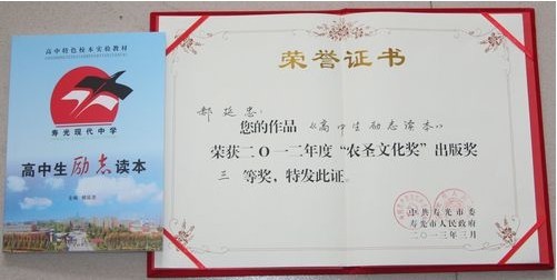 快讯:近日,由寿光市委、市政府举办的“2012年度农圣文化奖”评选揭晓,我校报送的两本校本教材《高中生励志读本》和《红楼梦》青少年版(通俗读物)获得较高评价,分别荣获“出版奖三等奖”和“文学创作奖三等奖”。