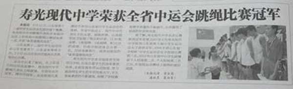 今天《寿光日报》再次报道我校消息:我校跳绳队在山东省第十二届中学生运动会上,代表潍坊市参加跳绳比赛,荣获20枚金牌、1枚银牌、3枚铜牌,积72分,列高中组团体总分第一名。http://221.1.80.11:81/new_sgrb/html/2013-09/03/content_149543.htm