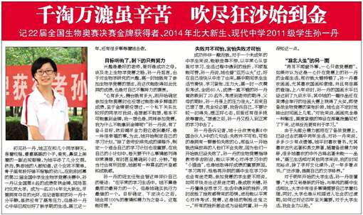 我校2011级学生孙一丹在第22届全国生物奥赛决赛上取得金牌,签约2014年北大新生后,《寿光日报》记者到校与孙一丹同学进行了深入的交流,今天B1版发表了采访报道。http://221.1.80.11:81/new_sgrb/html/2013-09/06/content_150125.htm