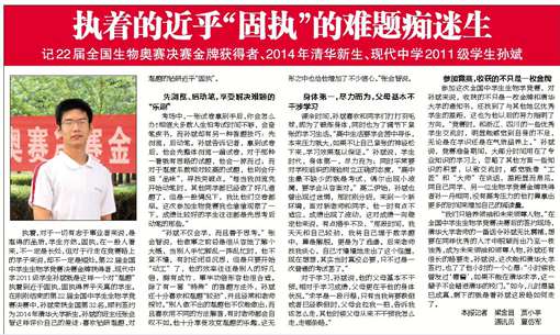 我校2011级学生孙斌,在获得第22届全国生物奥赛决赛获得金牌后,被清华大学现场签约为2014年新生。《寿光日报》日报记者几天前对孙斌进行了采访,今天在A5版发表了采访报道。http://221.1.80.11:81/new_sgrb/html/2013-09/09/content_150726.htm