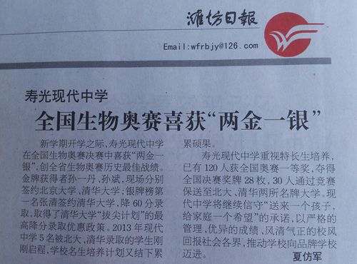 我校生物奥赛获得的“两金一银”战绩受到了社会各界的关注,9月13日,《潍坊日报》4版发表了此消息。随着我校教育教学质量的日益突出,社会声誉越来越高,我校的关注度也越来越高。学校的美好明天是我们每个现代人的希望,我们要时刻铭记“诚善勤敏”之校训,靠扎实的工作业绩为学校增光添彩,以培养高素质人才回馈社会各界。