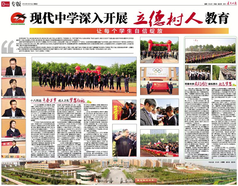 5月15日,寿光日报D4/5版以专版形式报道了现代中学深入开展“立德树人”教育,让每个学生自心绽放。