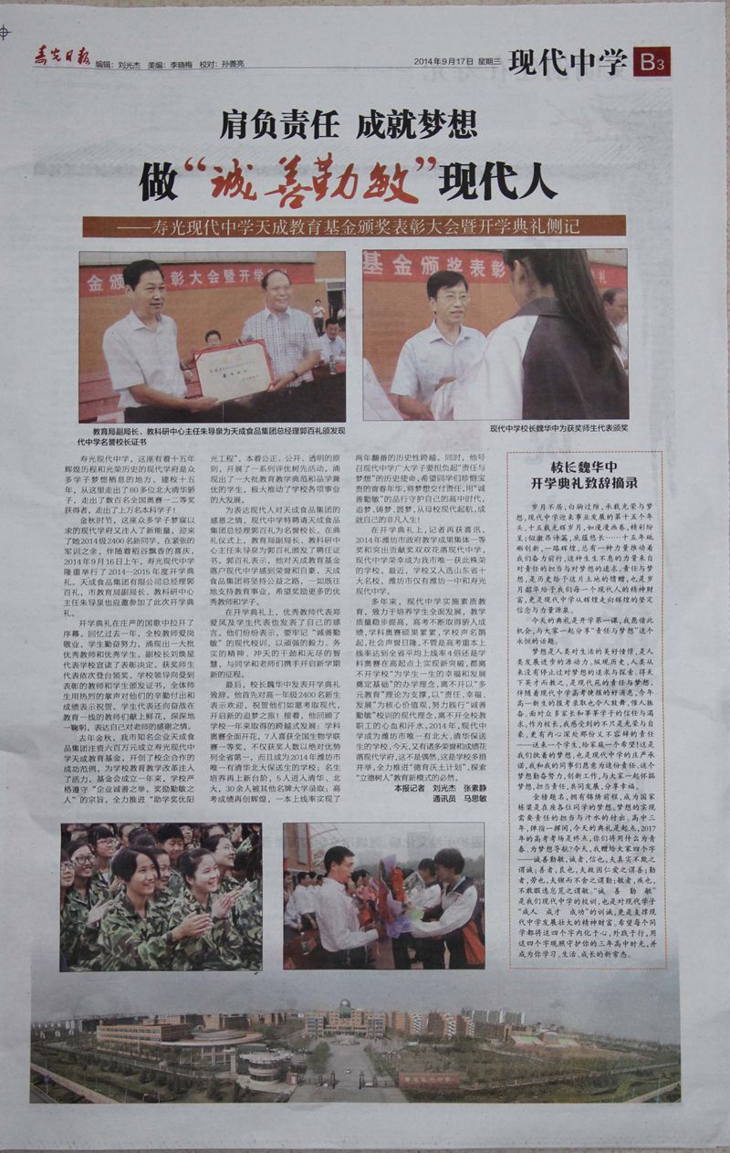 9月16日,在学校运动场我校召开了天成教育基金颁奖表彰大会暨开学典礼。17日《寿光日报》利用B3整版对此进行了报道。