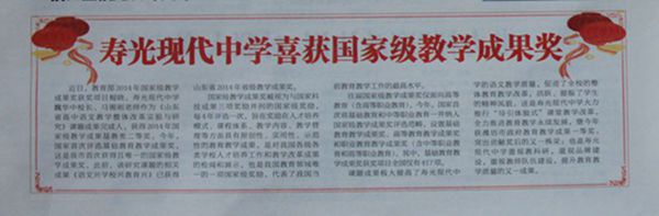 10月27日,《寿光日报》在头版位置报道了我校喜获国家级教学成果奖。