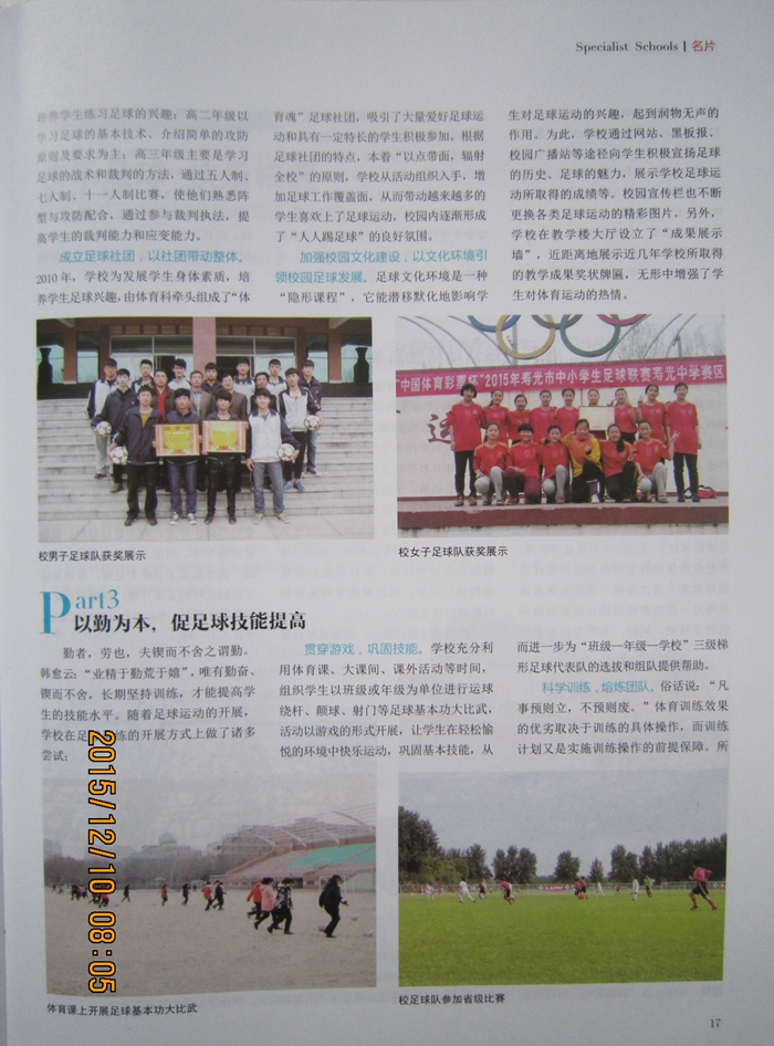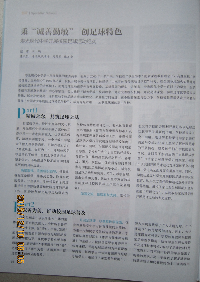 因我校获得“全国青少年足球特色学校”称号,由山东省教育厅主办的《山东体卫艺教育》采用纪实报道形式,对我校足球特色教育及学校“多元教育”办学特色给予大篇幅专题报道。