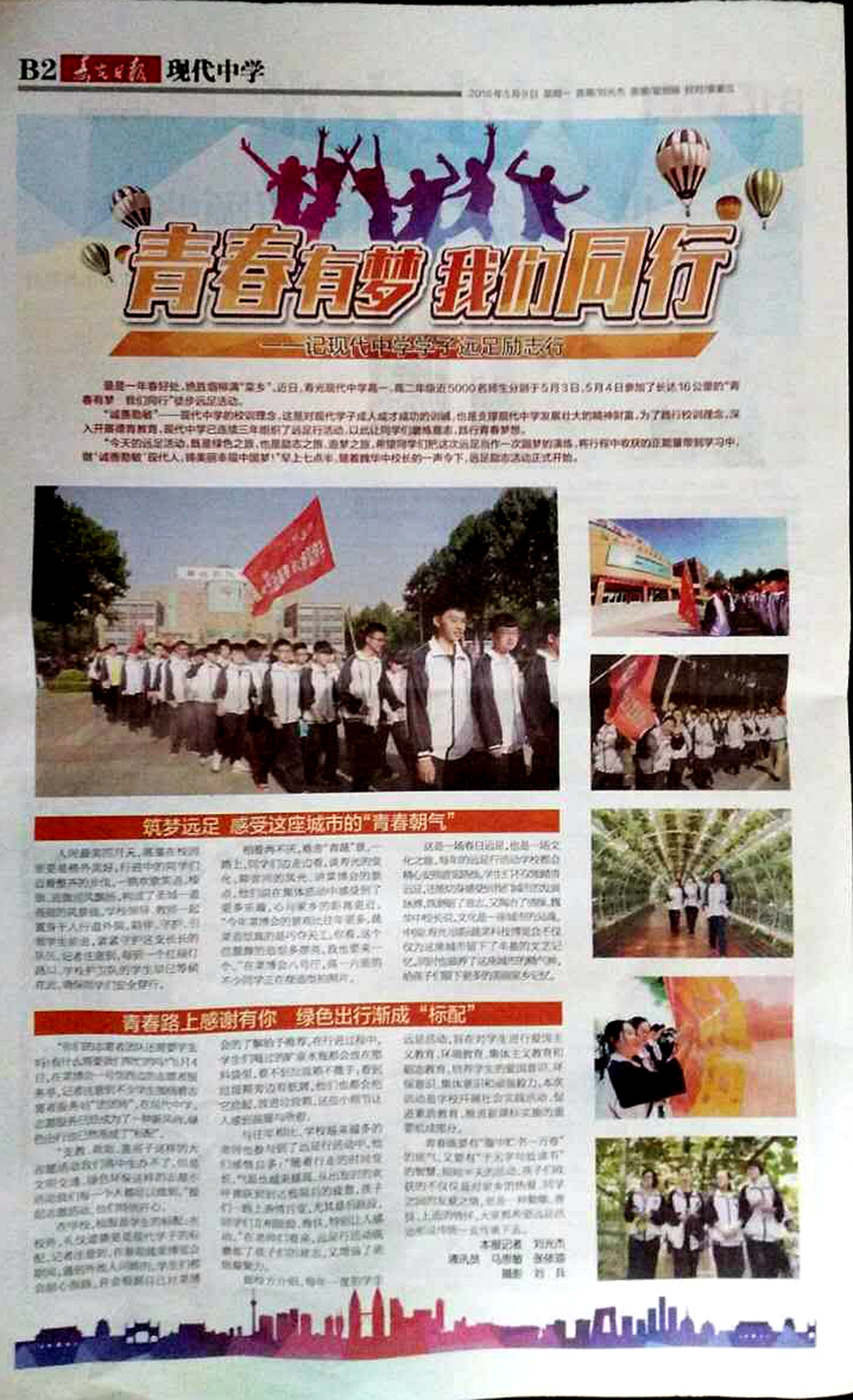 5月9日《寿光日报》B2版专版发表“青春有梦,我们同行”,记录高一、高二5000余师生徒步16公里远足励志活动。