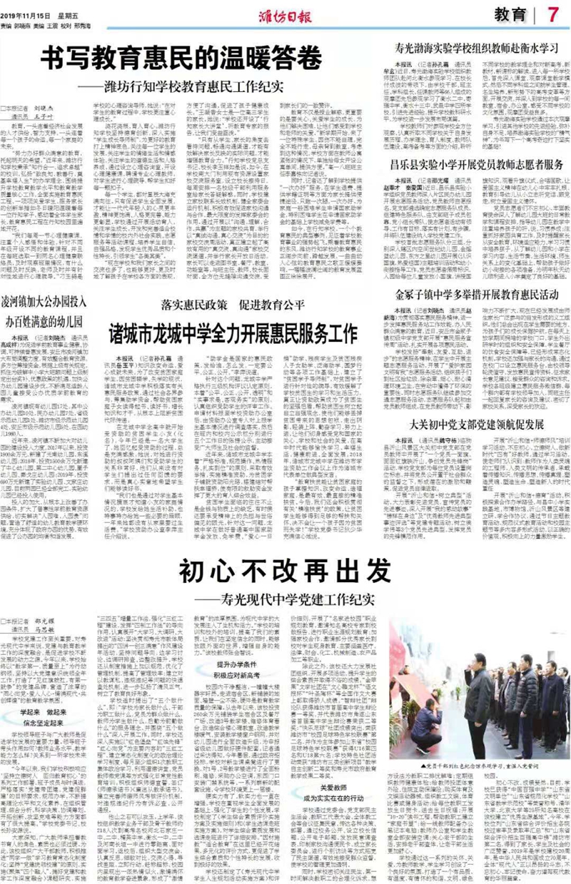 2019年11月15日,潍坊日报以《初心不改再出发》为题报道寿光现代中学党建工作。