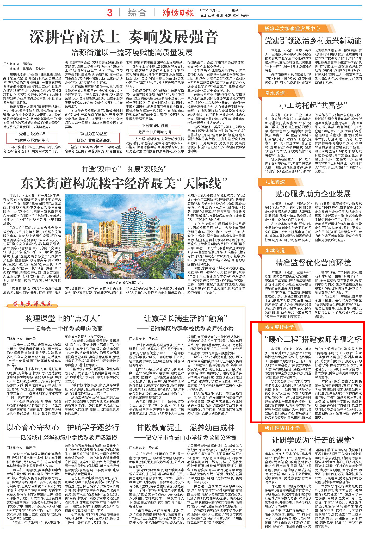 9月9日,潍坊日报第3版刊发题为《“暖心工程”搭建教师幸福之桥》的文章,介绍了我校在关爱教职工方面的宝贵经验。