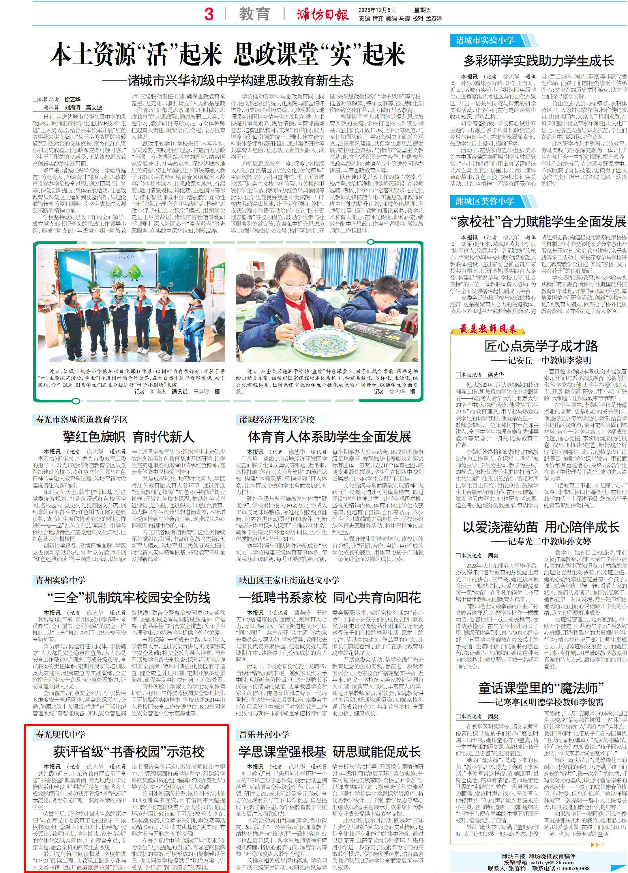 潍坊日报第三版刊发我校获评省级“书香校园”示范校新闻