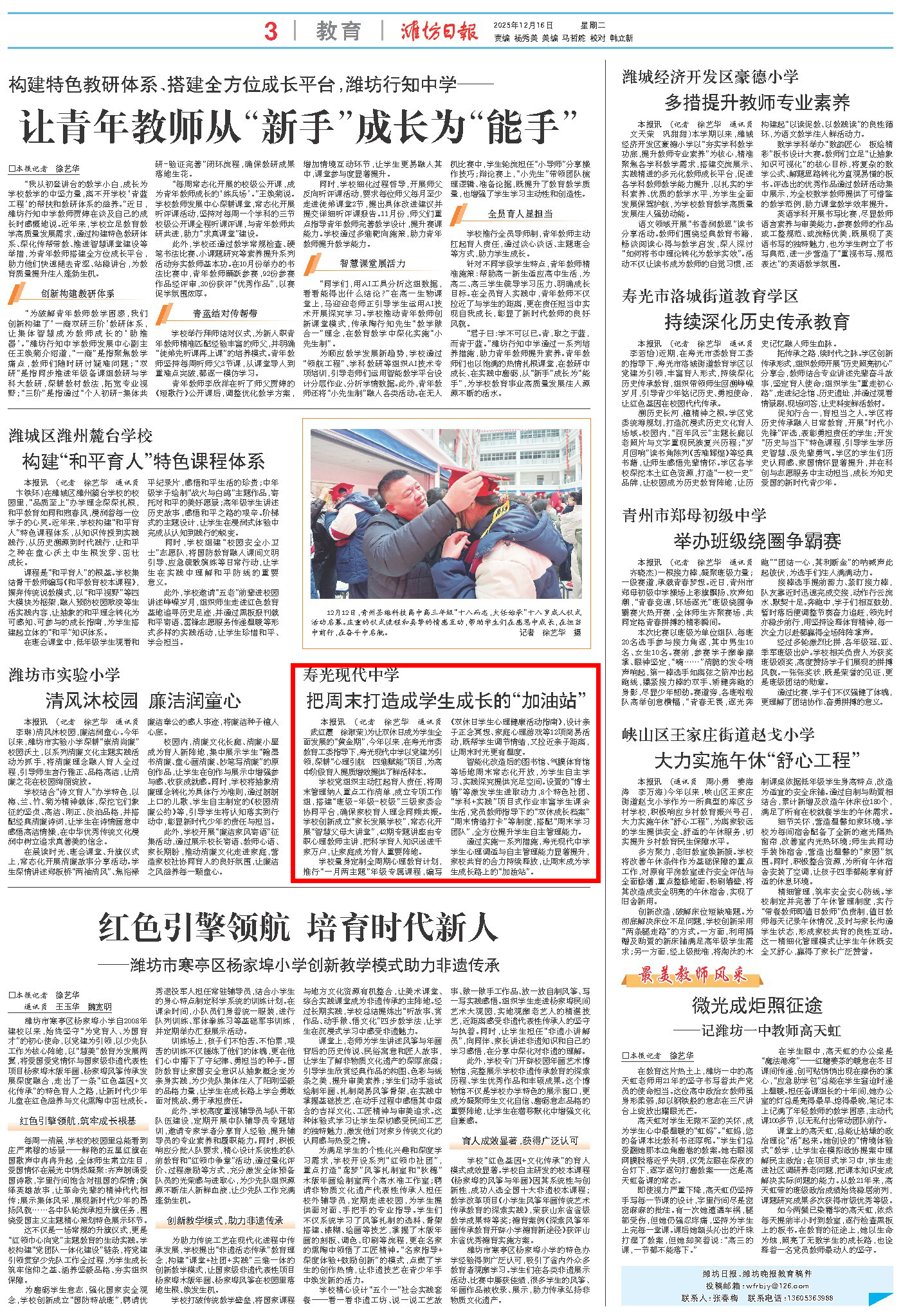 潍坊日报第三版刊发我校在育人提质增效工作中的经验做法