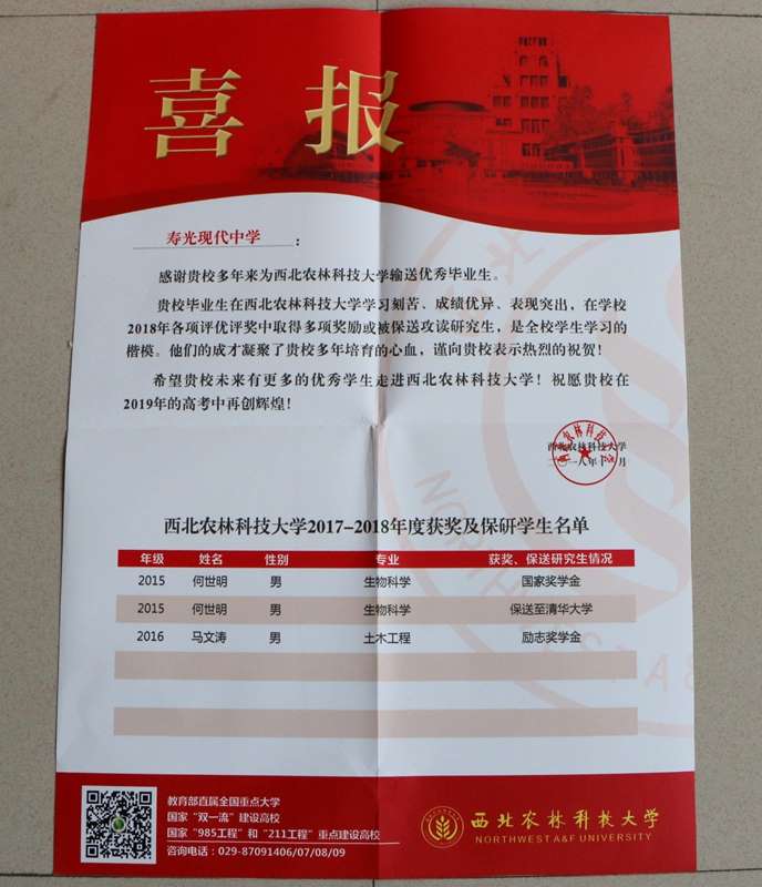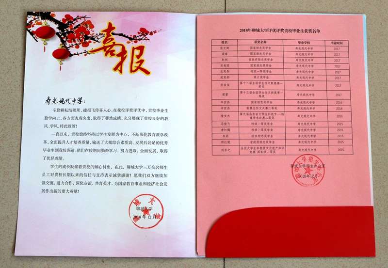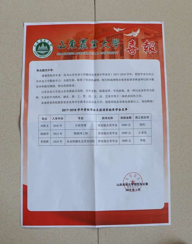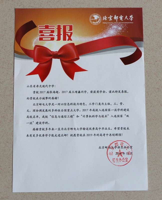 近日,华中科技大学、西北农林科技大学、北京邮电大学、山东农业大学、山东女子学院、聊城大学给我校发来喜报。我校毕业生继续发扬母校的优良学风,在大学刻苦学习,获得优秀成绩,为此,六所高校特向我校发来喜报,感谢寿光现代中学多年来一直为其输送优秀学生,对寿光现代中学的辛勤培育表示衷心感谢!